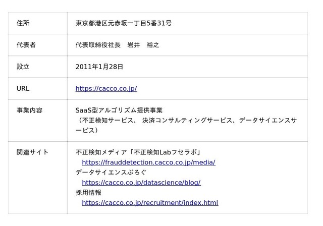 Caccoは、「未来のゲームチェンジャーの『まずやってみよう』をカタチに」という経営ビジョンを掲げ、セキュリティ・ペイメント・データサイエンス技術をもとに、アルゴリズム及びソフトウエアを開発・提供し企業の課題解決やチャレンジを支援することを目指しております。 オンライン取引における「不正検知サービス」を中核サービスとして位置づけ、不正ログインから不正注文対策まで対応可能な国内での導入実績数No.1の不正検知サービス「O-PLUX」や金融機関や会員サイトにおける情報漏洩対策の不正アクセス検知サービス「O-MOTION」、フィッシング対策サービス等を提供しております。