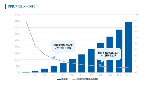 マーケティング: ROAS(費用対効果)、応募率、内定率の数値モデルを6~12ヶ月スパンでシミュレーションし、データに基づいた改善運用を行います。