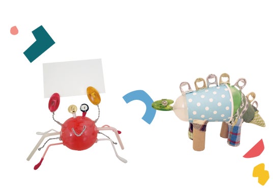 ワークショップいきものペーパースタンドを作ろう!廃材からどうやって作品が作られているかを知り、要らなくなったものからオリジナルのペーパースタンドを作ります。