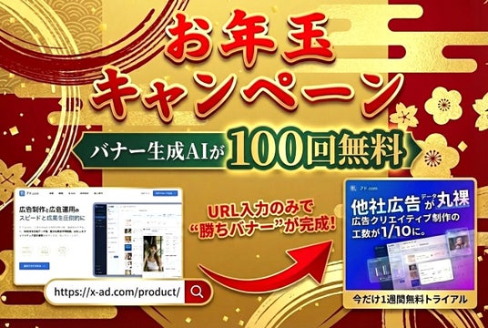 本キャンペーンでは、既存ユーザー様および新規トライアルユーザー様を対象に、URLを入力するだけで”勝てる”バナーを自動生成できる「バナー生成AI」を、100回分(1回につき16枚生成、計1,600枚分)無料で提供いたします。