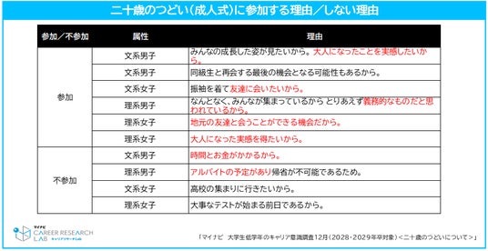 ◆大学生の「二十歳のつどい」への参加率は77.6%。一方で、参加しない理由は「アルバイトがあるため」「時間やお金がない」の声も