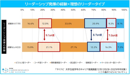 ◆大学生の「リーダーシップ経験」によって「理想のリーダータイプ」にギャップ。経験がある学生は「民主型リーダー」を、ない学生は「コーチ型リーダー」を選ぶ傾向に