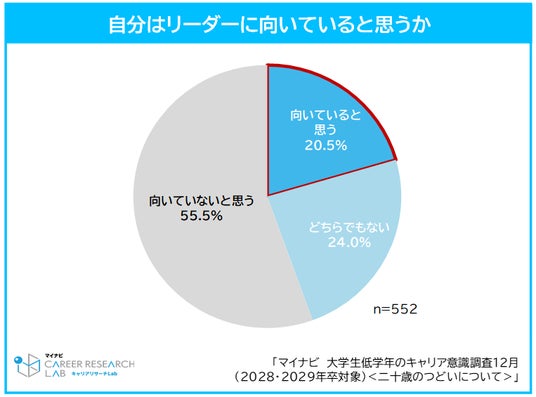今年「二十歳のつどい」を迎える大学生にリーダー観を尋ねたところ、「自分はリーダーに向いていない」と答えた学生が半数を超えました。また、「リーダーシップを発揮した経験がある」学生は約2割にとどまっており、経験がないことから「自分は向いていない」と考える学生もいるのではないでしょうか。