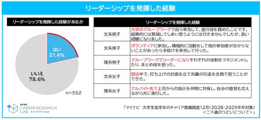 「二十歳のつどい」を迎える大学生に「自身がリーダーに向いていると思うか」を尋ねたところ、「向いていると思う」※2と回答した学生は20.5%、「向いていないと思う」※3と回答した学生は55.5%と半数以上で、多くの学生が自分を「リーダーに向いていない」と認識していることがわかった。また、「リーダーシップを発揮した経験」については、「経験がある」と回答した学生は21.4%であった。具体的な経験としては、「部長」や「グループワークのリーダー」など、役割としてリーダーを任された経験が多くあげられたが、それ以外にも「ボランティア」や「アルバイト」で自発的にリーダーシップを発揮した経験も寄せられた。【図4、5】