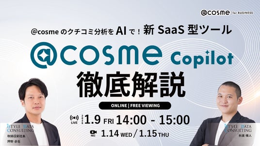 株式会社アイスタイル(代表取締役社長:遠藤 宗、以下 当社)は@cosmeに登録された商品の中で、1件でもクチコミ投稿がある商品に対して分析でき、かつ過去2014年以降のデータを対象に自ブランドの現状分析やマーケティング施策の振り返り、商品開発などに活用できるSaaS型の次世代AI分析ツール、「@cosme Copilot 」を1月15日(木)に正式ローンチすることをお知らせいたします。