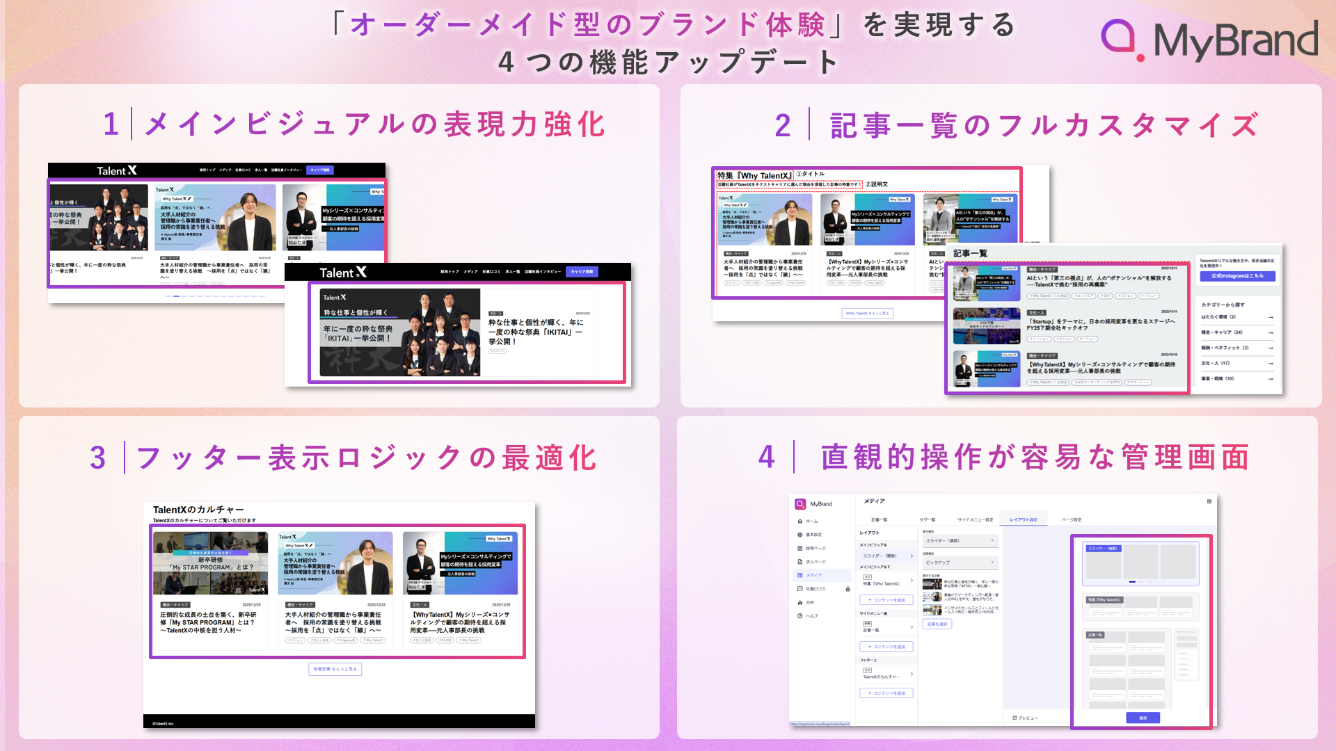 株式会社TalentX(本社:東京都新宿区、代表取締役社長CEO:鈴木 貴史、以下「当社」)は、採用DXプラットフォーム「Myシリーズ」の採用ブランディングサービス「MyBrand」で構築する、採用オウンドメディアのUI(ユーザーインターフェース)をアップデートいたしました。これにより、企業は自社のフェーズや採用ターゲットに合わせた、多角的かつ個別最適化されたブランド体験を候補者へ届けることが可能になります。