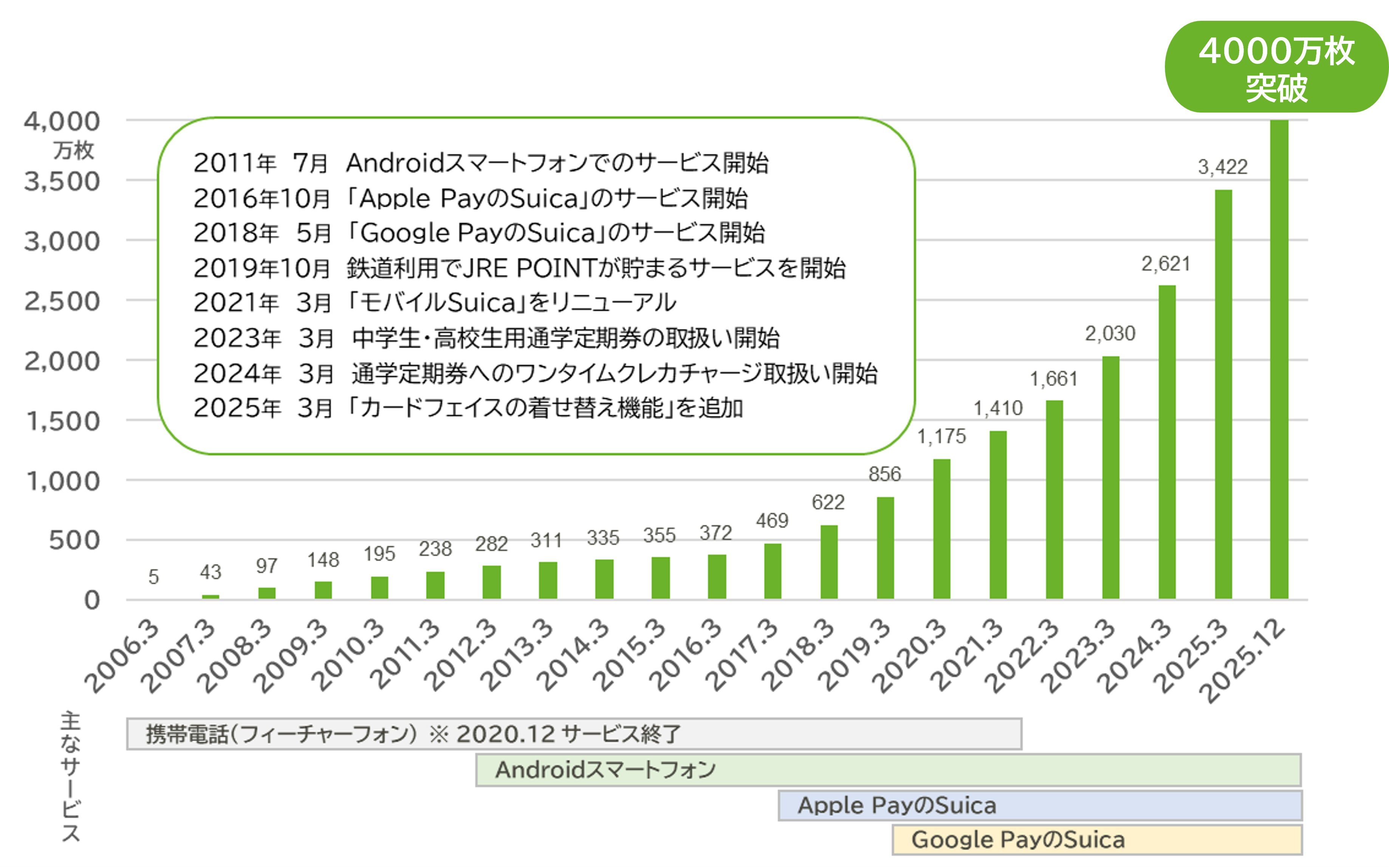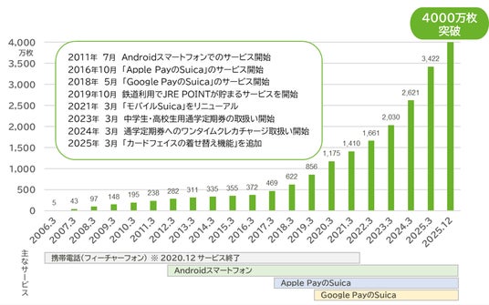 2006年1月28日よりサービスを開始した「モバイルSuica」は、おかげさまで2025年12月16日に発行数4,000万枚を突破いたしました。多くのお客さまにご利用いただいておりますことを感謝申し上げます。