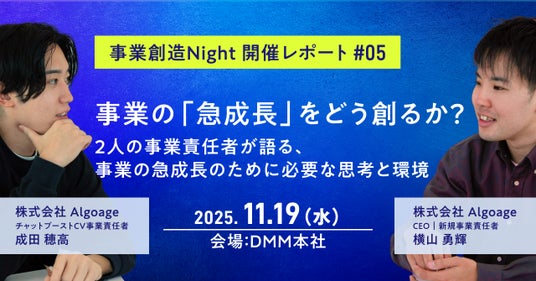 11月19日(水)、第5回となる「事業創造Night #05│事業の急成長をどう創るか? 2人の責任者が語る、事業の急成長のために必要な思考と環境」を開催いたしました。当日は、当社CEOであり新規事業責任者も務める横山と、執行役員でありチャットブーストCV事業責任者の成田が登壇。“事業創造会社”Algoageがどのように複数事業を生み出し、推進し、次の挑戦へとつなげているのか。主力事業の急成長を牽引する視点と、新たな事業を0から生み出す視点の双方から、事業成長に必要な思考や環境、そしてBizDev(事業開発)としてのキャリアのリアルについて、パネルディスカッション形式で語りました。