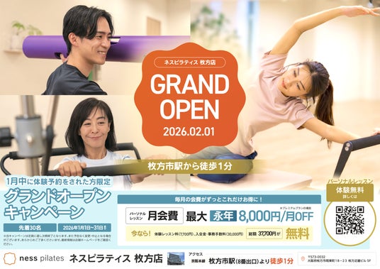 株式会社New Conditioning(所在地:東京都千代田区神田錦町2-2-1 KANDA SQUARE 11F、代表取締役:石田涼太郎)、整体とマシンピラティスを組み合わせたパーソナル専門スタジオ「ness pilates(ネスピラティス)」の4号店となる枚方店を、2026年2月1日にグランドオープンいたします。
