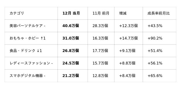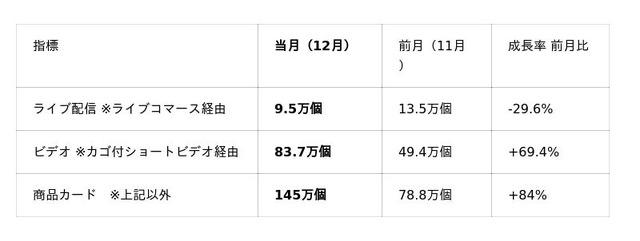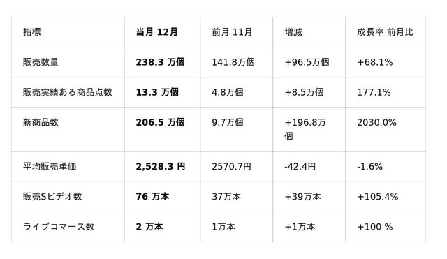 12月も11月に引き続き、前月比成長率が60%を超える高水準の成長を維持しています。その背景として、11月に続く新商品数の増加や、12月に実施されたプラットフォーム主導の年末向けセールなどの販売施策が成長を押し上げたことが挙げられます。加えて、12月は販売ショートビデオの投稿本数およびライブコマースの実施本数が前月比でいずれも100%以上増加しており、これらの施策が全体の販売量拡大に大きく寄与したと考えられます。
