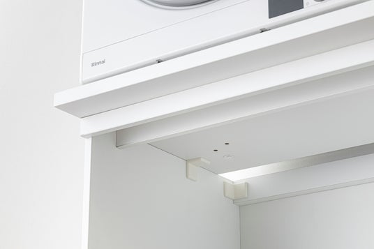 「乾太くん」を洗濯機上の空間にも設置できるよう、配線・蛇口用の切り欠きがあります。また、巾木避けの切り欠きもあるため、壁面に隙間なく設置でき、スペースの有効利用にも貢献します。
