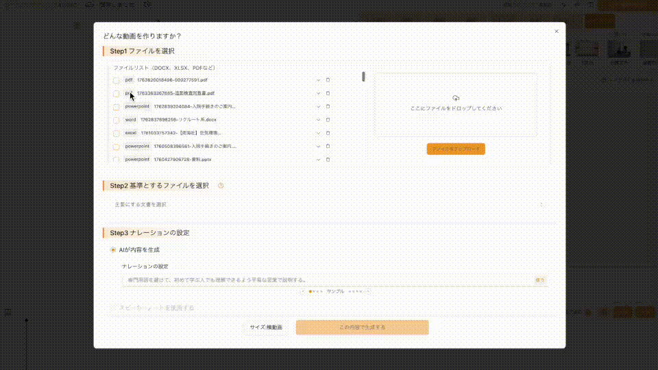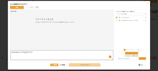 作りたい内容を文章で入力するか、PowerPoint・Word・PDFなどの資料をアップロードして、動画の元になる構成案を作成します。
