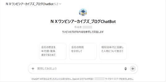 ※カスタムGPTでは、ナレッジデータをWEB上にアップロードして使用するため、著作権上問題のない資料や公知情報でのチャットボット構築を推奨します。
