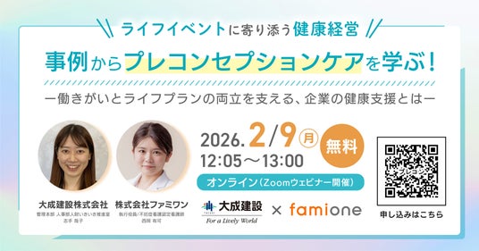 「子どもを願うすべての人によりそい 幸せな人生を歩める社会をつくる」をビジョンに掲げ、法人の従業員向け福利厚生や自治体の住民向け支援を行うヘルスケアサポートサービス「ファミワン」 https://famione.com/benefit/ などを展開する株式会社ファミワン(本社:東京都渋谷区、代表取締役:石川 勇介)は、2026年2月9日(月)に企業のご担当者様を対象とし、「ライフイベントに寄り添う健康経営 事例からプレコンセプションケアを学ぶ!-働きがいとライフプランの両立を支える、企業の健康支援とは-」をテーマに無料オンラインセミナーを開催いたします。