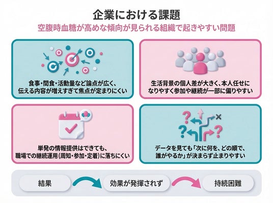 空腹時血糖が高めな傾向は、本人の意識や知識だけではなく、仕事の都合による食事時間のずれ、間食の取り方、会食や出張、在宅勤務時の過ごし方など、働き方に結びついた日常行動の影響を受けやすいテーマです。だからこそ、個人任せの啓発ではなく、職場として扱うテーマと順番を整理し、日常行動の整え方を「組織の取り組み」として回る形に整えることが重要になります。