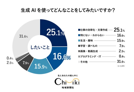 「生成AIを使ってどんなことをしてみたいですか?」という質問に対して、回答の1位は「仕事の効率化・文章作成」で25.1%でした。しかし、まだまだ生成AIは発展途上で、仕事で利用する際のルールや仕組み作りが整っているとは言い難い状況にあります。それは回答の2位が「特にない・わからない」であることからもうかがえます。3位以降は、趣味や調べもの、画像や動画生成と続き、わずかながらプログラミングやITという回答もありました。