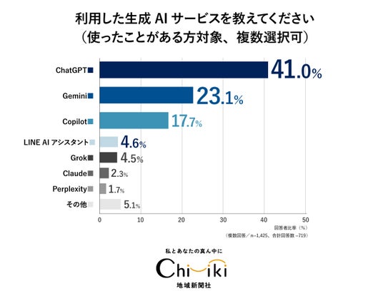 「利用したことのある生成AIサービスは何ですか?」という質問に対し、圧倒的1位は生成AIブームの火付け役である「ChatGPT(チャットジーピーティー)」で、回答の約4割を占めました。2位のGoogleが開発した「Gemini(ジェミニ)」、3位のマイクロソフトが開発した「Copilot(コパイロット)」と続きます。4位以下は、LINEと連携した「LINE AIアシスタント」やXと連携した「Grok(グロック)」、安全性と倫理性に配慮した「Claude(クロード)」、最新情報検索・ファクトチェックに特化した「Perplexity(パープレキシティ)」など、特色ある生成AIの名前が上がりました。