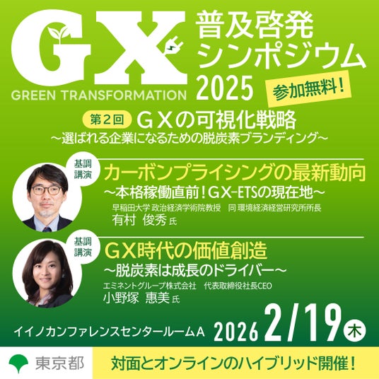 東京都では、都内中小企業等の脱炭素化を促進するため、都内の中小企業や都民の皆様などを対象に、企業がGXに取り組むメリットや先進的な取組事例等を紹介する「GX普及啓発シンポジウム」を開催しています。このたび、「GXは企業戦略~選ばれる企業になるための脱炭素ブランディング~」をテーマに、令和7年度第2回シンポジウムを開催します。ぜひご参加ください。