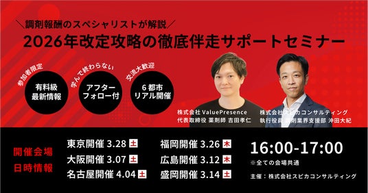 企業価値を最大化する「バリューアップコンサルティング」と「業界特化型M&A」を提供する株式会社スピカコンサルティング(本社:東京都港区、代表取締役:中原 駿男、以下「当社」)は、調剤薬局従事者を対象に、3月7日(土)~4月4日(土)の期間、東京・大阪・名古屋・福岡・広島・盛岡の6都市にて、2026年度の調剤報酬改定への早期対応を支援する「2026年改定攻略の徹底伴走サポートセミナー」を開催します。詳細・申込:https://spicon.co.jp/seminar/pharmacy/26special/