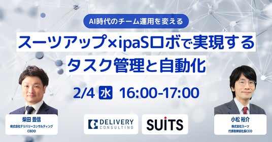 当社と株式会社デリバリーコンサルティングとは、2026年2月4日(水)16:00より、オンラインセミナー「スーツアップ×ipaSロボで実現するタスク管理と自動化 」を無料開催します。