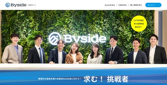 M&Aアドバイザリー事業を展開するByside株式会社(本社:東京都千代田区、代表取締役:川畑勇人)は、事業拡大および採用強化に伴い、採用サイトを全面リニューアルいたしました。