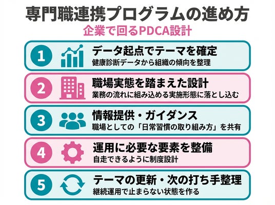・専門職連携プログラム:健康診断データを起点に、専門職が役割分担しながら、企業が実施しやすい施策設計と運用方法を整理する仕組みです。