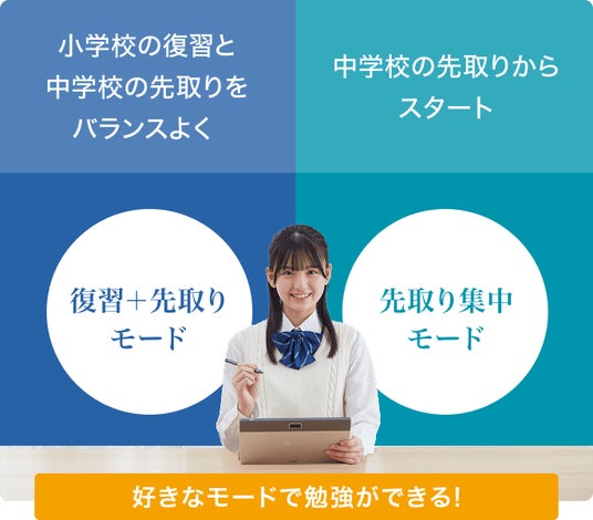 小学校で習った単元の見直しをスキップし、中学の考え方へと発展させる先取り学習のみに取り組む学習モードです。小学生のうちからZ会をはじめとした校外学習に取り組んでいる方におすすめです。