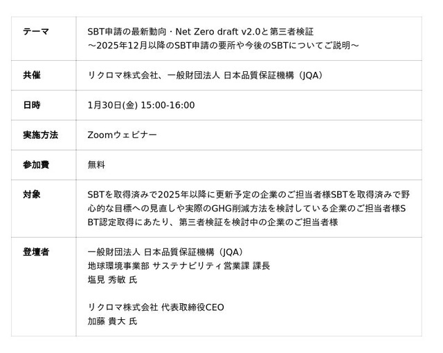 企業の気候変動対応支援を行うリクロマ株式会社(本社:東京都渋谷区、代表取締役社長:加藤貴大、以下「リクロマ」)は、一般財団法人 日本品質保証機構(本部:東京都千代田区、理事長:石井 裕晶、以下「JQA」)と共同で、SBT(Science Based Targets)申請の最新動向および第三者検証の重要性を解説するウェビナーを1月30日(金) 15時より実施します。