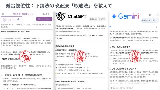 最新法令への即応: 成立・公布されたばかりの法律や、今後出される政令・公取委規則をリアルタイムで学習・反映します。適法性の確保: 弁護士法72条に配慮し、最終的な法的判断ではなく、条文やガイドラインに基づく「情報提供・論点整理」に特化しています。