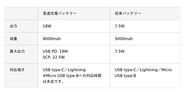 - バッテリーの仕様について:このたび展開する予定のバッテリーは、Type-C、Lightningの2端子に対応いたします。Type-Bにも対応した3端子タイプも今後展開を予定していますが、時期は未定です。