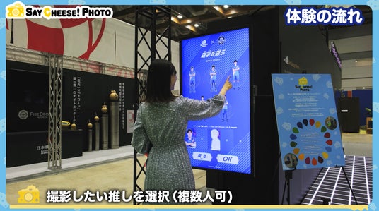SAY CHEESE! PHOTO(AR推し撮影)推しと一緒に写真撮影ができるAR(拡張現実)フォトコンテンツです。 好きな人物やキャラクターを選ぶとARによって生き生きと動き出すとともにリアルタイムに自分と合成され、まるで推しと一緒にいるかのような写真撮影を楽しめる体験型コンテンツです。撮影した写真は2次元コードからスマホにダウンロードし、思い出として持ち帰ることができます。