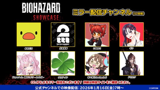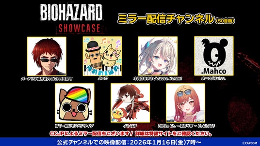 お気に入りの配信者の方と一緒に盛り上がりながら、最新情報をリアルタイムで体験できるミラー配信。1月16日(金)の朝は、ぜひみんなで一緒に「バイオハザード ショーケース」を楽しもう!