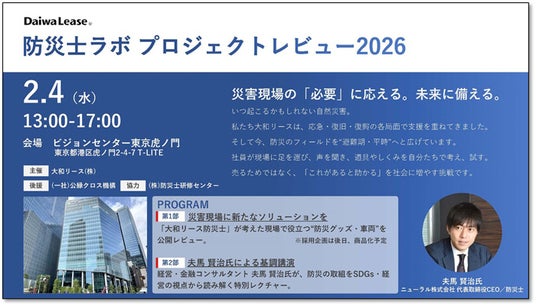 大和ハウスグループの大和リース株式会社(本社:大阪市中央区、社長:北 哲弥)は、防災士有資格者による社内プロジェクト「防災士ラボ」の最終成果発表会として、「防災士ラボ プロジェクトレビュー2026」を、2026年2月4日(水)に東京・虎ノ門にて開催いたします。