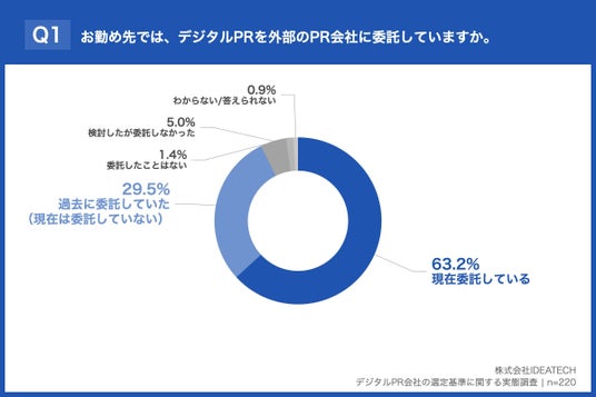 当社が企業の広報・マーケティング担当者220名に行った独自調査では、デジタルPRを外部会社に「現在委託している」が63.2%、「過去に委託していた」が29.5%となり、委託経験そのものが当たり前になっていることが明らかになりました。