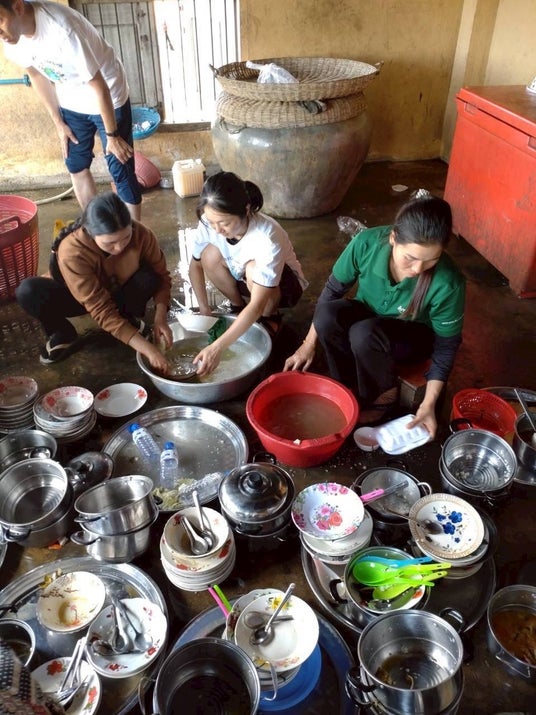 アクリルたわしを使って洗い物を行う難民キャンプの方々となかよし学園事務局長中村里英