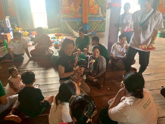 なかよし学園は、こうした状況を踏まえ、Chi Kraengの避難民収容寺院などシェムリアップ州に設置された難民キャンプ及び紛争地域に指定されているアンロンベンにおいて、避難民児童生徒への教育支援(教材を用いた授業・アクティビティ)と、各校提供米を活用した炊き出し(おにぎり提供)を実施しました。