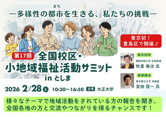 社会福祉法人豊島区民社会福祉協議会(豊島区東池袋1-39-2/会長:山本ナミエ)は、地域福祉活動の活動者が実践報告を行い、参加者と交流を行う「第17回全国校区・小地域福祉活動サミットinとしま」を令和8年2月28日(土)10:30~16:30、大正大学にて開催します。
