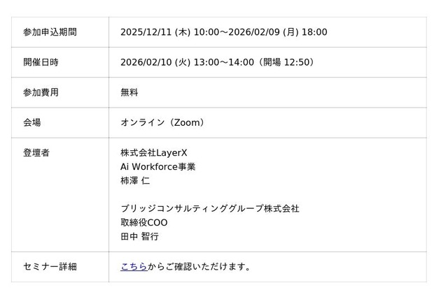 公認会計士人材の知見・経験を活用した経営支援サービスを展開するブリッジコンサルティンググループ株式会社(所在地:東京都港区、代表者:宮崎良一)は、2026年2月10日(火)「AIでここまで変わる!経理・管理部門の業務効率と監査対応の最前線」をテーマに無料オンラインセミナーを開催します。