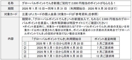 三菱UFJニコスは1月15日から5月31日まで、三菱UFJカードの個人会員向け優待特典「グローバルポイントでんき」への新規加入でもれなく2,000円相当のポイントがもらえるキャンペーンを実施します。