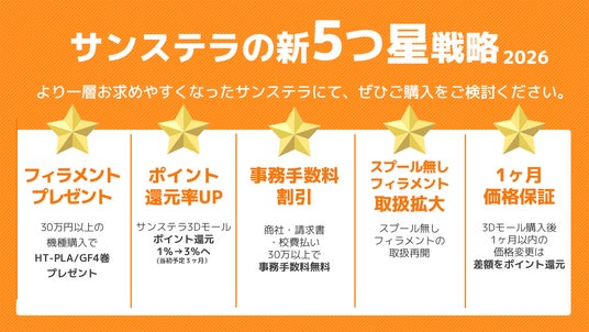 株式会社サンステラは、3Dプリンターおよび3D材料の専門商社として、「3D材料ならサンステラ」「安心して買えるサンステラ」を掲げ、