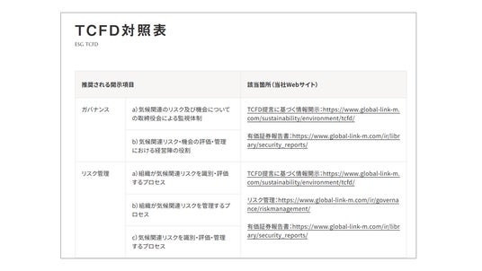 改善例:ESG関連情報(非財務情報)についての対照表を新たに追加(https://www.global-link-m.com/sustainability/esgdata/tcfd/)