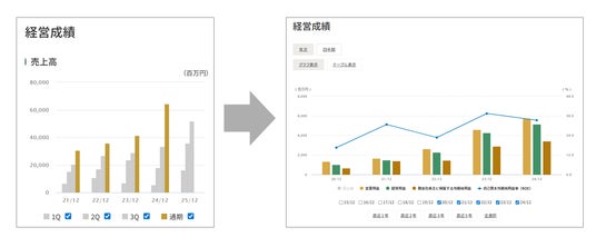 改善例:IR「業績ハイライト」ページにおいて、目的に応じてチャートを加工できるジェネレータ機能を追加(https://www.global-link-m.com/ir/highlight/)