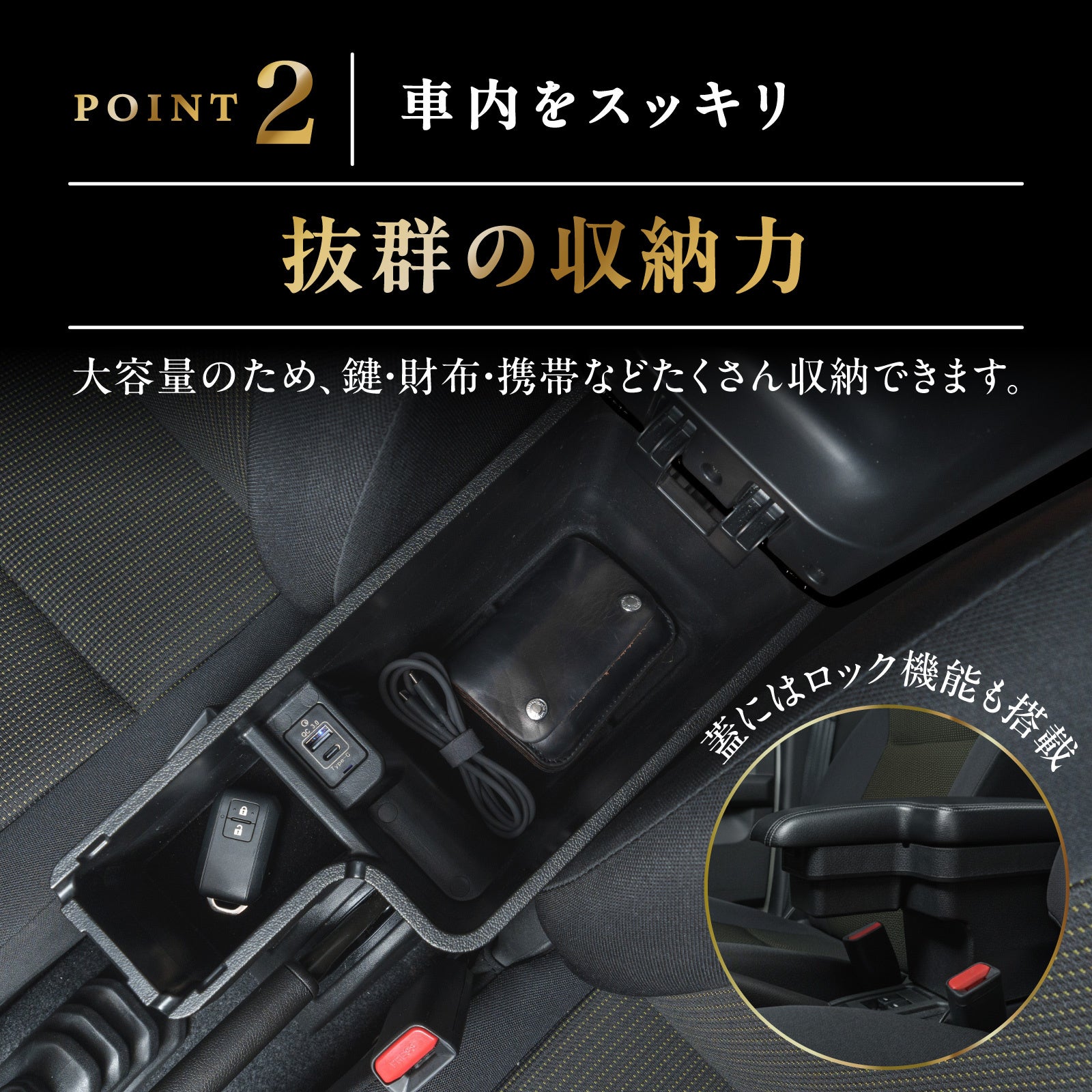 - アームレストで快適ドライブ- 抜群の収納力
