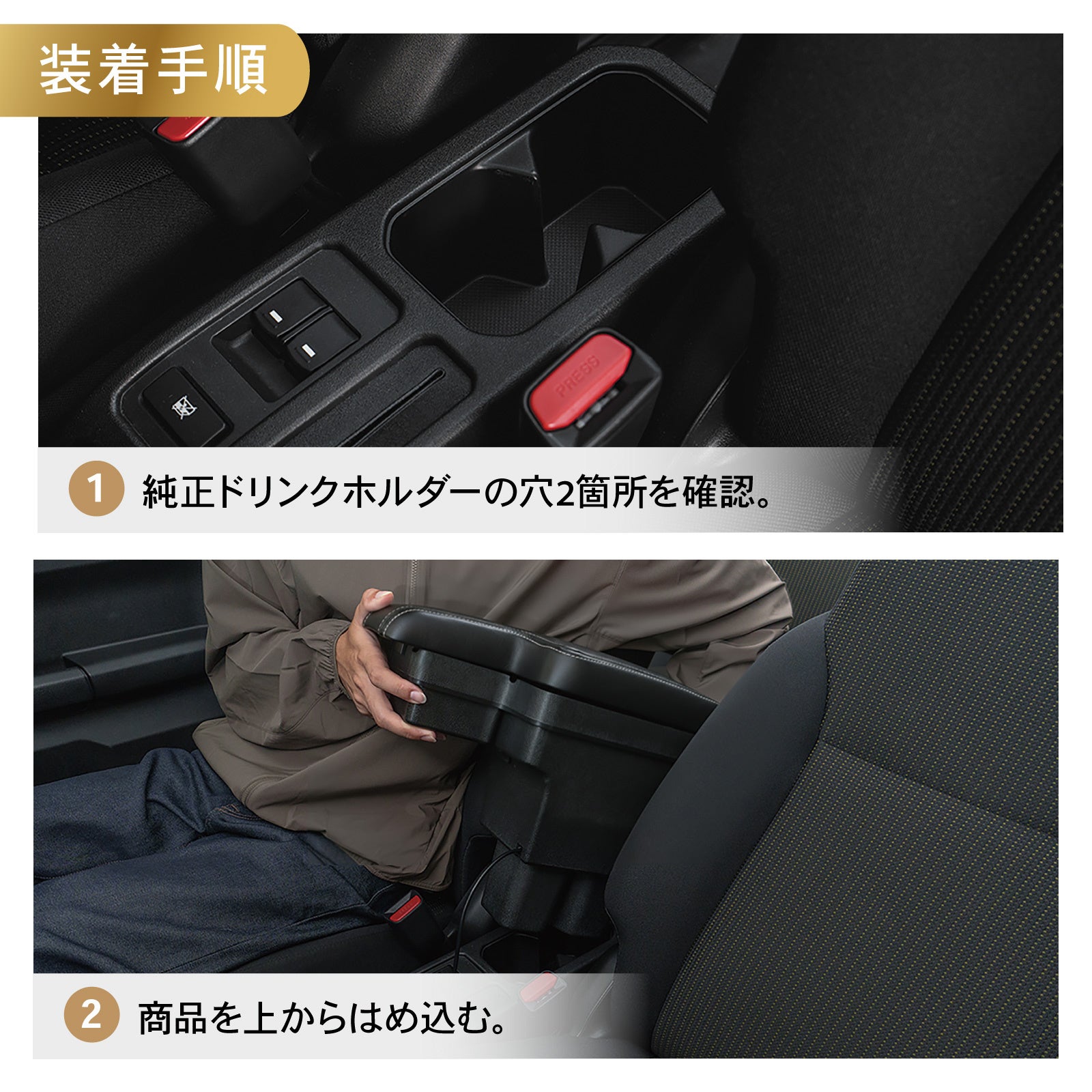 - 純正ドリンクホルダーの穴2箇所を確認。- 商品を上からはめ込む。