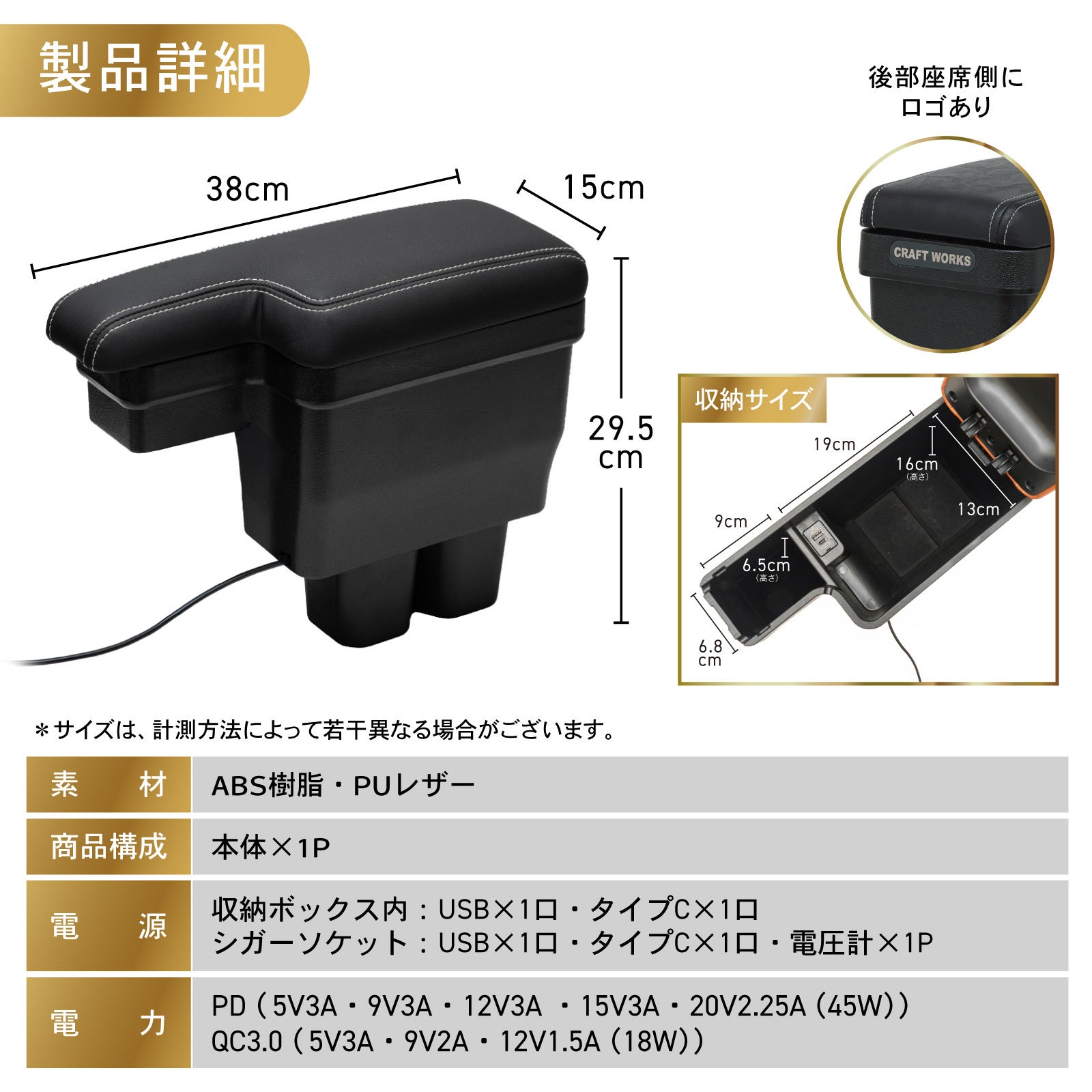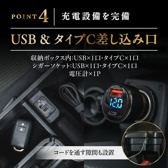 充電設備を完備収納ボックス内:USB × 1口・タイプC × 1口