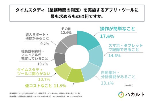 調査の最後、「タイムスタディ(業務時間の測定)を実施するアプリ・ツールに最も求めるものは何か」を尋ねる設問への回答では、1位が「操作が簡単なこと」で17.6%、2位が「スマホ・タブレットで記録できること」で14.6%、3位が「自動集計・分析機能があること」で13.1%という結果になりました。また、4位以降も回答率10%を超える回答が複数並ぶ形となり、この結果から、介護施設の施設長がタイムスタディアプリ・ツールに求めるものは、多岐にわたることがわかりました。