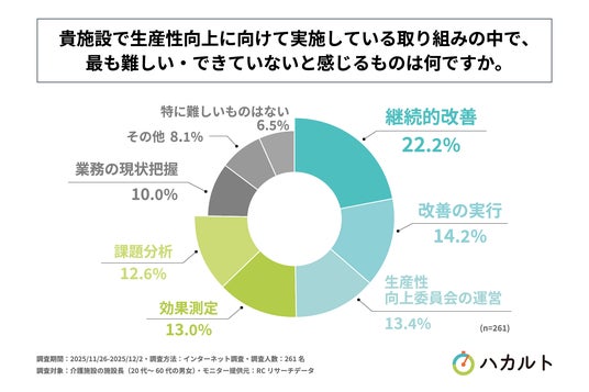 次に、「貴施設で生産性向上に向けて実施している取り組みの中で、最も難しい・できていないと感じるものは何か」を尋ねる設問への回答では、1位が「継続的改善」で22.2%、2位が「改善の実行」で14.2%、3位が「生産性向上委員会の運営」で13.4%という結果になりました。また、4位以降も回答率10%を超える回答が複数並ぶ形となり、この結果から、介護施設の生産性向上に向けた取り組みの中で最も難しい、または、取り組めていないと感じるものは、多岐にわたることが明らかになりました。