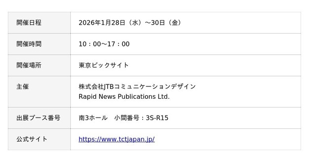 エレクトロニクス商社の丸文株式会社(代表取締役社長 兼 CEO / COO︓堀越裕史、本社︓東京都中央区、以下、丸文)は、1月28日(水)~30日(金)に東京ビックサイトで開催される「TCT Japan 2026」にVisitech社と共同出展します。