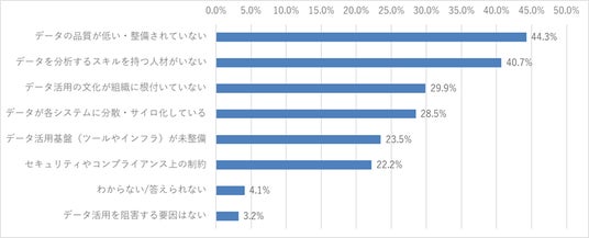 次は、全社的なデータ活用阻害している要因について聞いてみました。