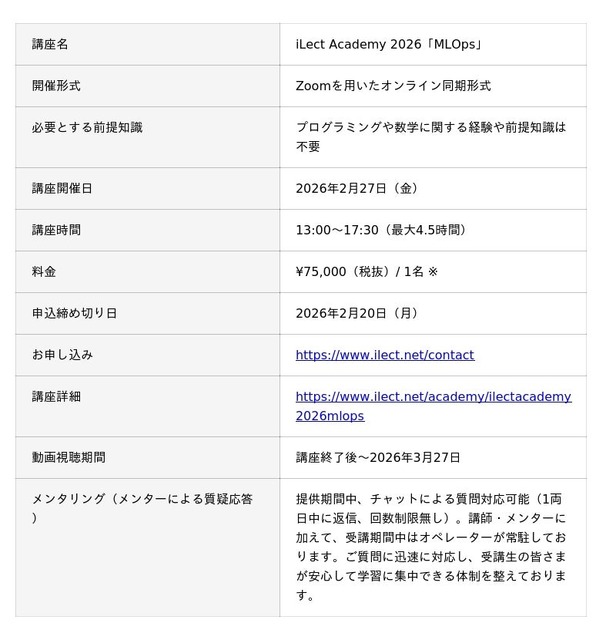 AI総合研究所として活動するNABLAS株式会社(本社 : 東京都文京区本郷、 代表取締役 所長 : 中山 浩太郎、 以下「当社」)が提供する実課題の解決を目的としたAI人材育成サービス iLect は、この度、複数社合同講座 iLect Academy 2026 にて「MLOps講座」(以下:当講座)の開催を決定し、申込受付を開始しました。